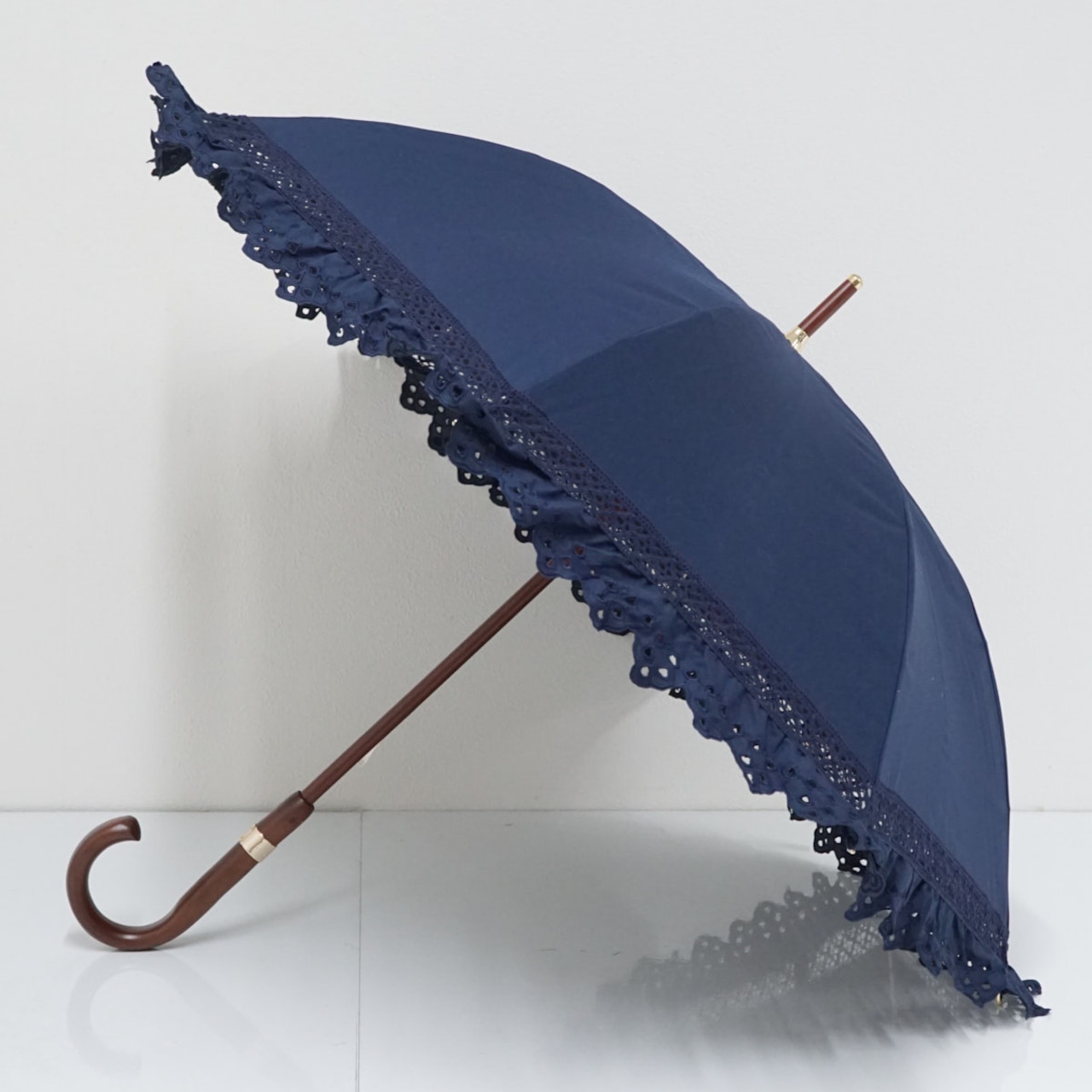 スカラップレースやはしごレースで縁取りを飾ったフリルがレディライクなデザインのパラソルです。