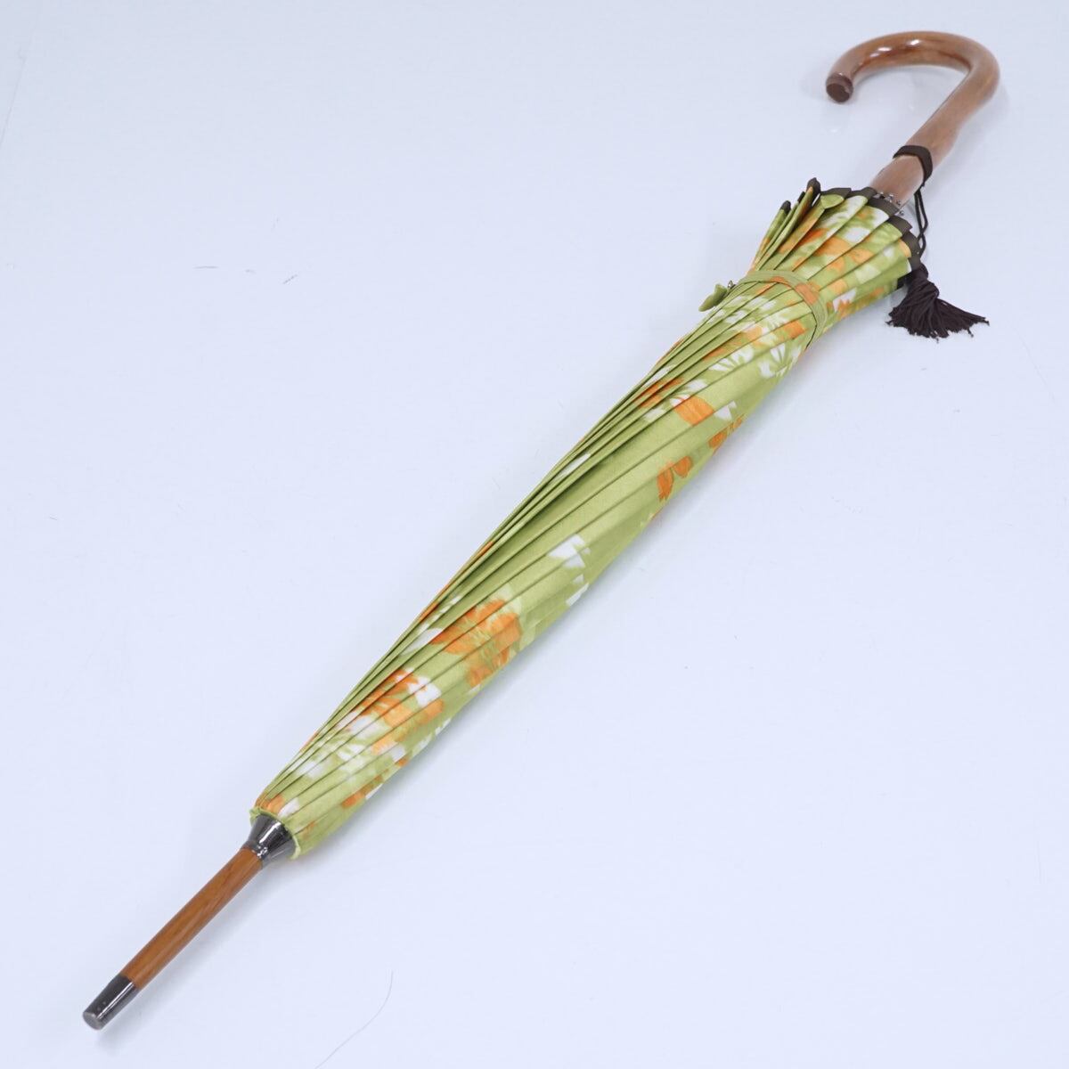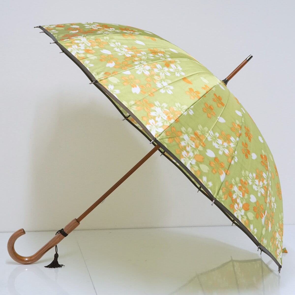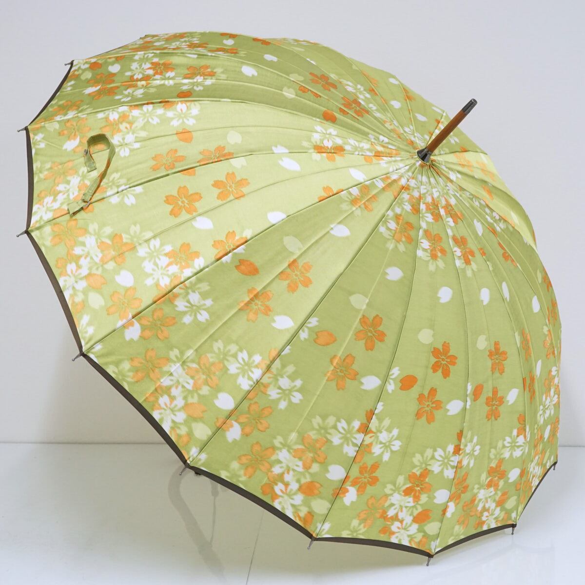 16本骨高級傘 舟久保織物 USED美品 ライトグリーン 桜吹雪 木製手元 ほぐし織 タッセル付き 55cm S2066