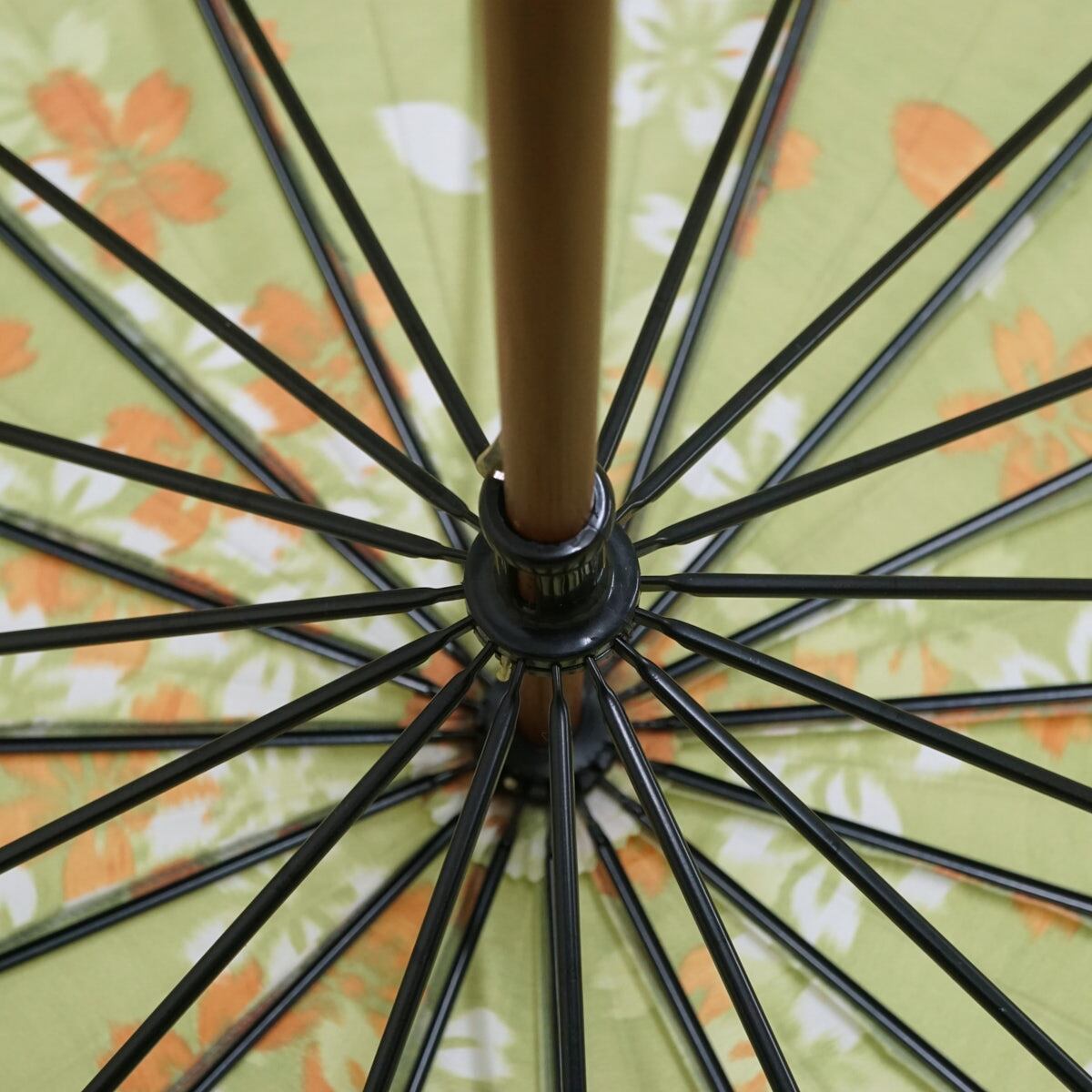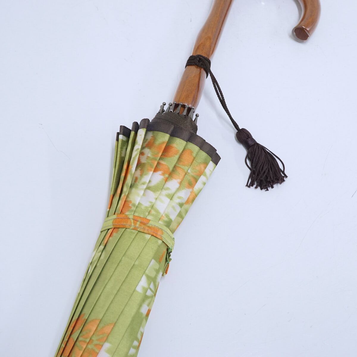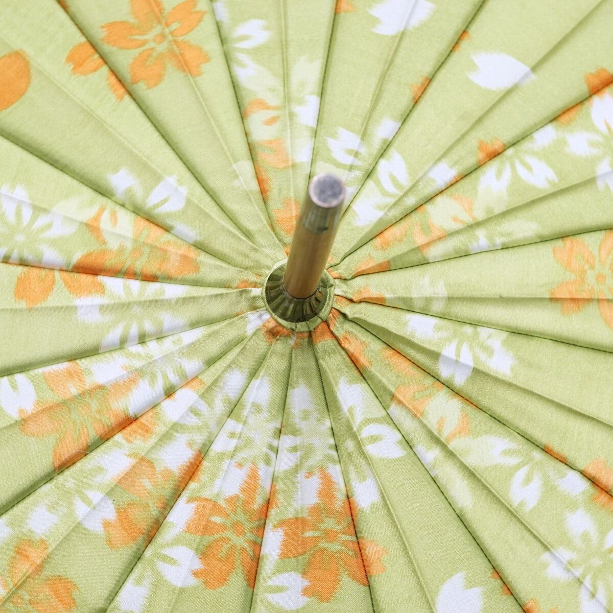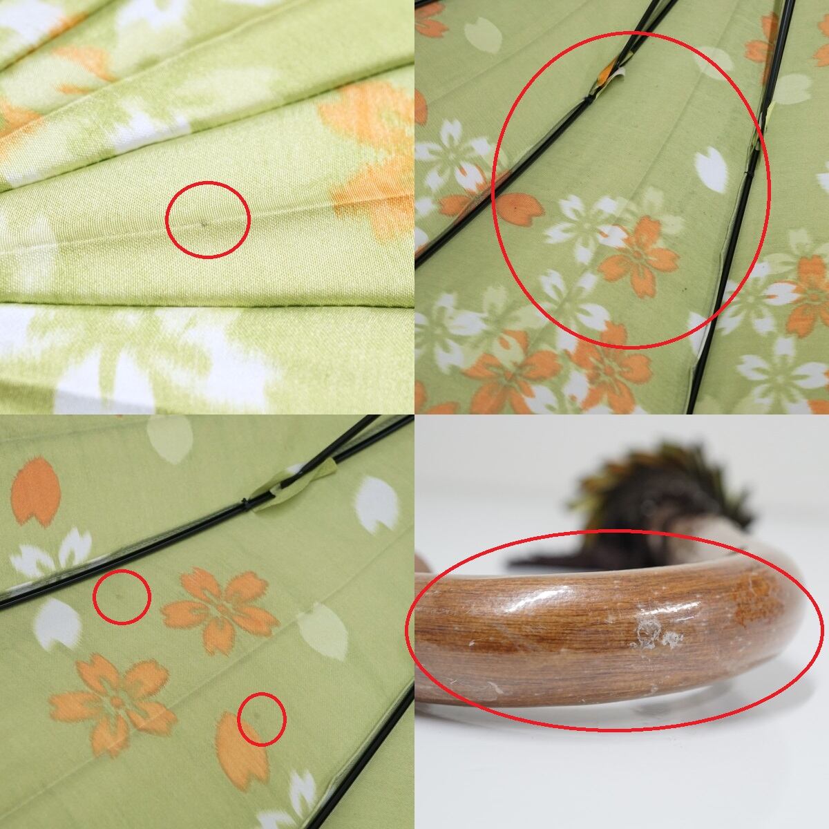 16本骨高級傘 舟久保織物 USED美品 ライトグリーン 桜吹雪 木製手元 ほぐし織 タッセル付き 55cm S2066