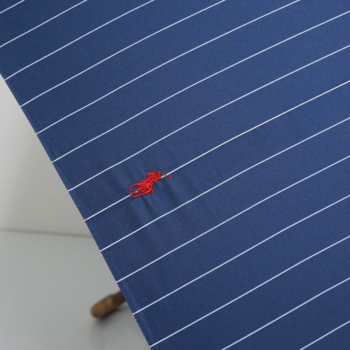 ネイビーの生地にホワイトのラインを入れたストライプデザインで、一コマに赤いポロ刺繍を入れてブランド感を演出しています。