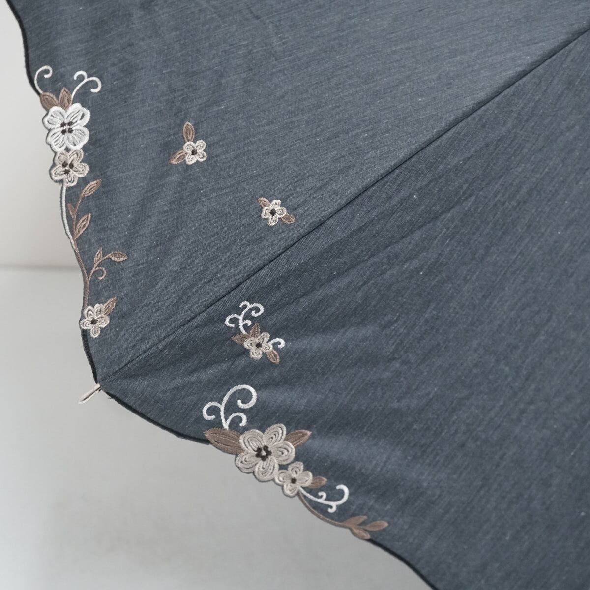 ダークグレーの生地に縁取りのフラワー刺繍がエレガントな一品です。