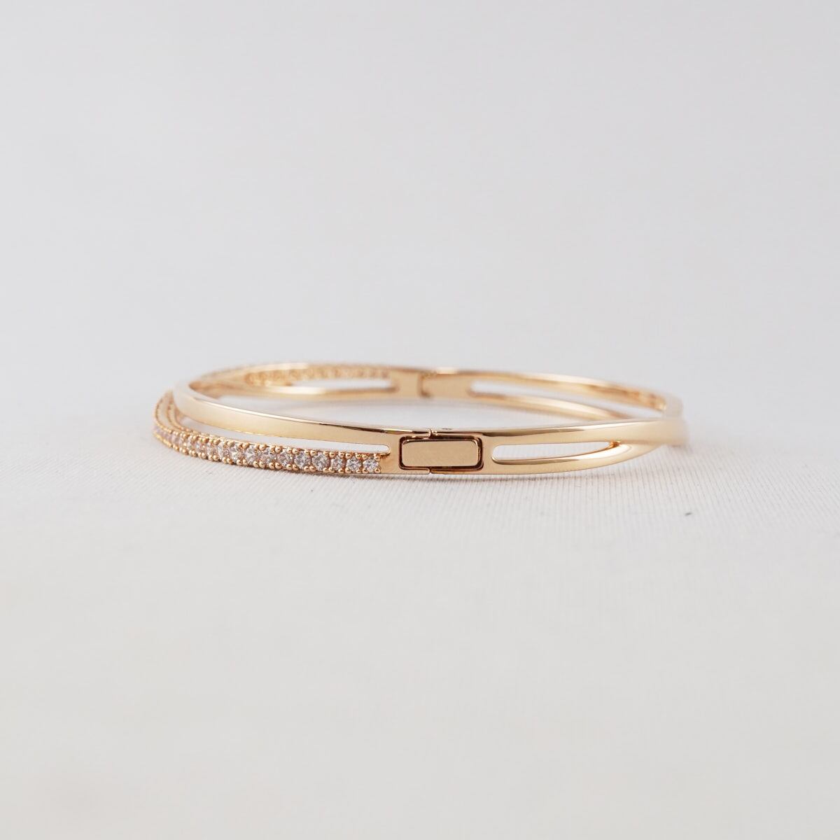 メタルのラインとホワイトストーンをあしらったラインがしなやかに交わる、ラグジュアリーな雰囲気の逸品です。