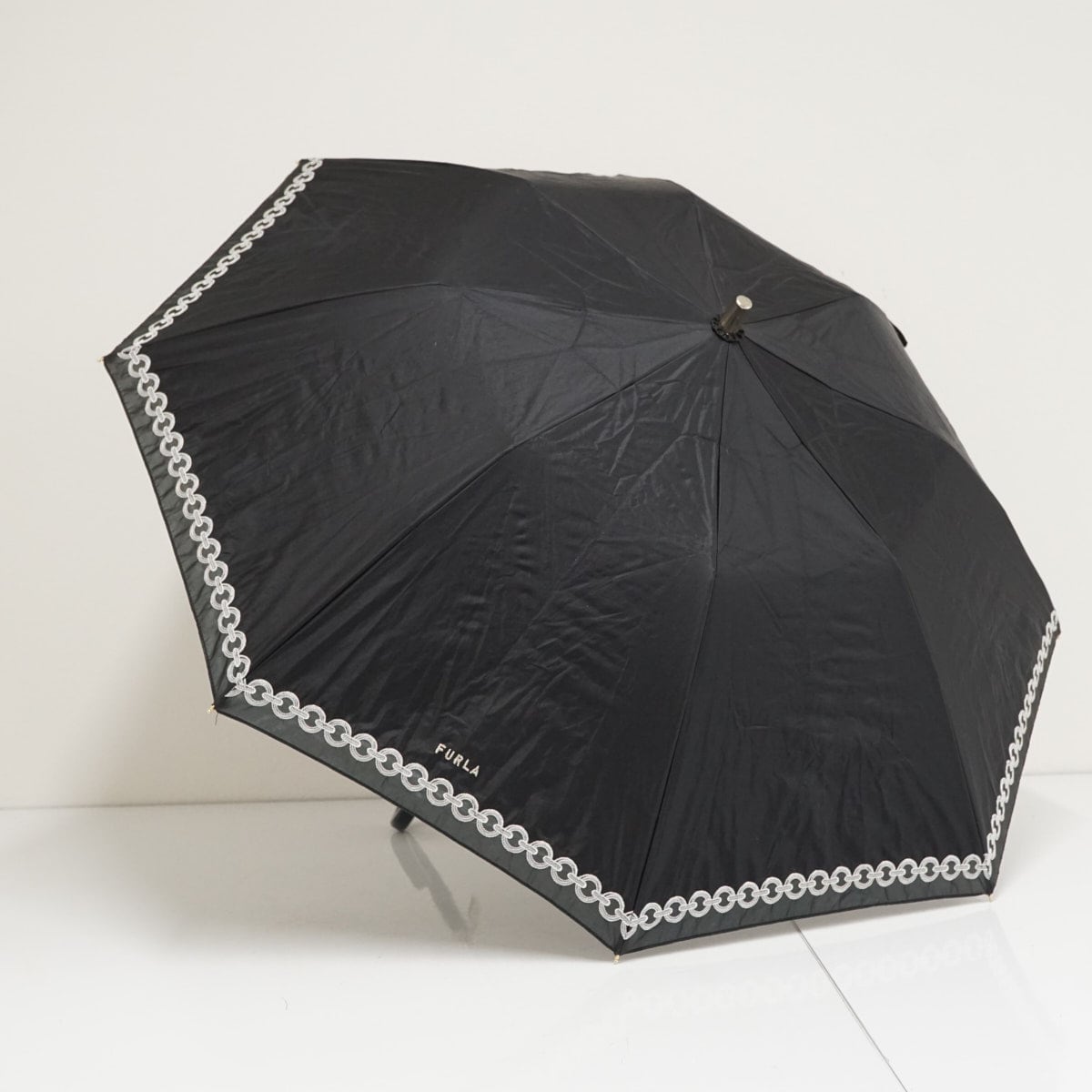 折りたたみ日傘 FURLA フルラ USED品 晴雨兼用 オーガンジー チェーン刺繍 ブラック ハートチャーム UV 50cm FA9495